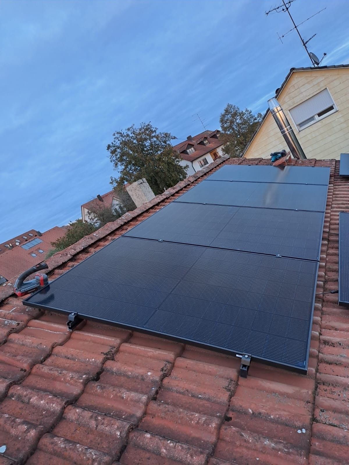 Dieses Montageset ermöglicht die Befestigung von bis zu 4 Solarmodulen und sorgt somit für eine effiziente Nutzung der verfügbaren Dachfläche. Durch die Ost-West-Ausrichtung wird die solare Energieerzeugung optimiert, indem die Module sowohl morgens als auch nachmittags Sonnenlicht einfangen.